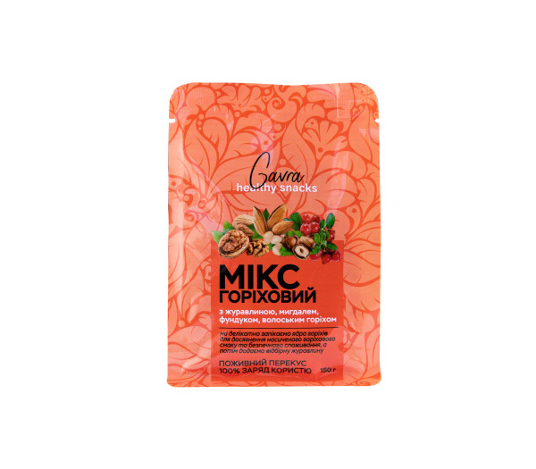 Горіховий мікс з журавлиною від Гавра — це вдале поєднання ніжної ягідної кислинки й поживного горіхового хрумту. У складі: сушена журавлина, волоський горіх, фундук і мигдаль — без доданого цукру, без консервантів, лише натуральні інгредієнти.
